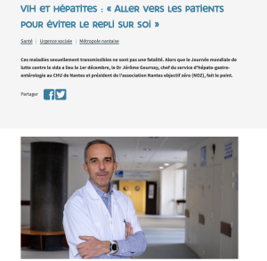 A l'occasion de la Journée Mondiale de lutte contre le VIH/ Sida, la Ville de Nantes a publié une interview de Jérôme Gournay, Président de l'association NOZ et Chef du Service Hépato-Gastro-Entérologie du C.H.U de Nantes en présentant les actions de Nantes Objectif Zéro.